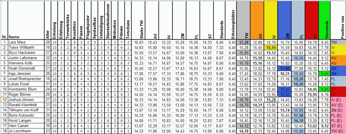 Grau habe ich die 5 besten Werte jeder Position markiert, bei den Standards nur 2.