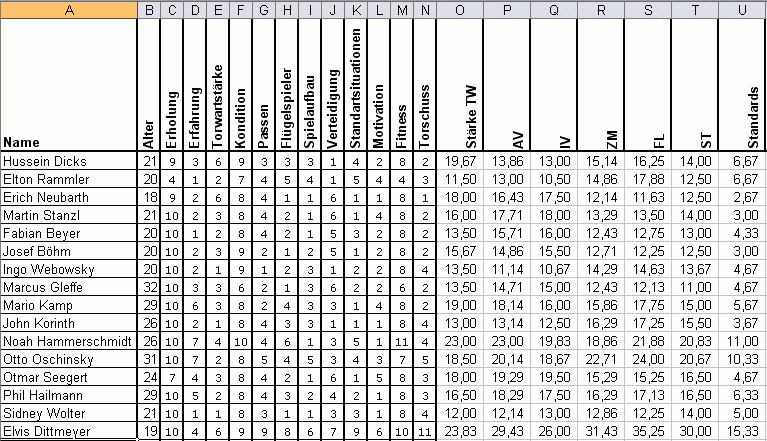 würde mal sagen, dass die tabelle eh scho n aufschluss gibt, wo deine spieler einsetzen solltest, kannst durch die friendlys dann ja n bisserl herumspielen und mal schauen, ob der eine oder andere erstzspieler net doch besser is (war bei mir auch der fall). |